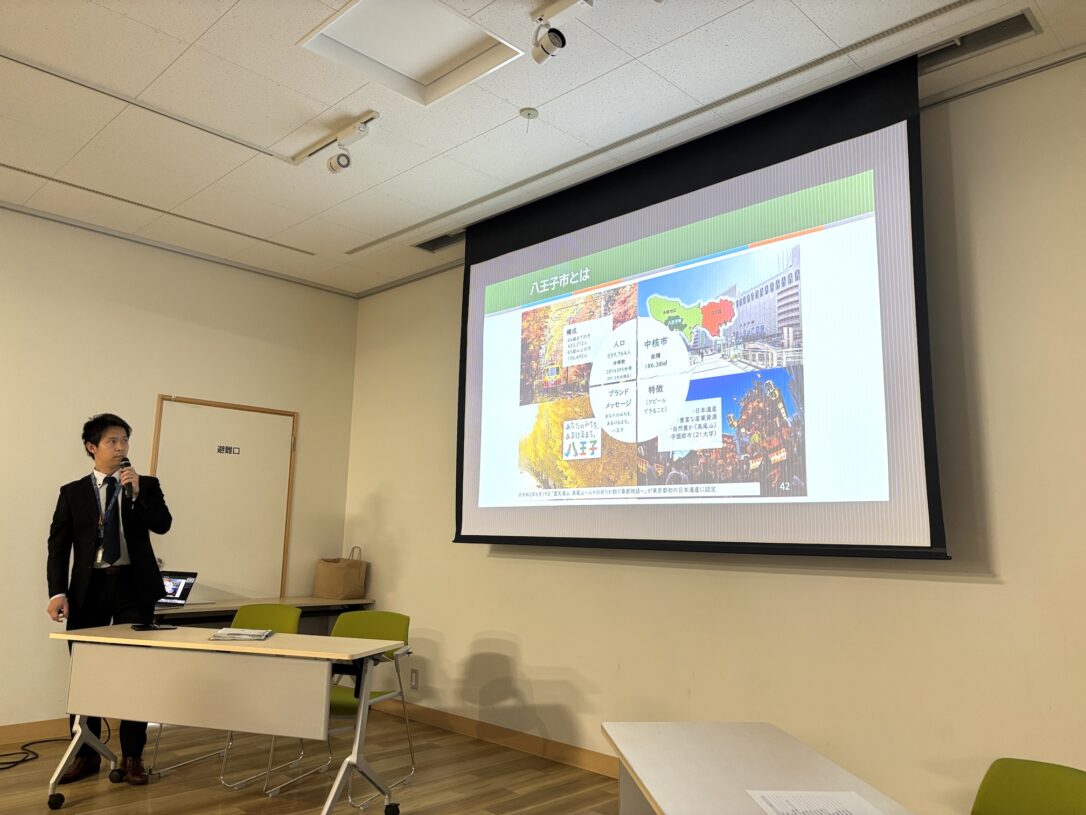 次に、今回の企画をアレンジいただいた八王子市 産業振興部 産業振興課 課長補佐兼主査の高山友紀氏からの挨拶の後、「八王子市における共創の取組について」と題し、総合経営部 経営改革課 主査 阿部田直樹氏より事例紹介をいただきました。