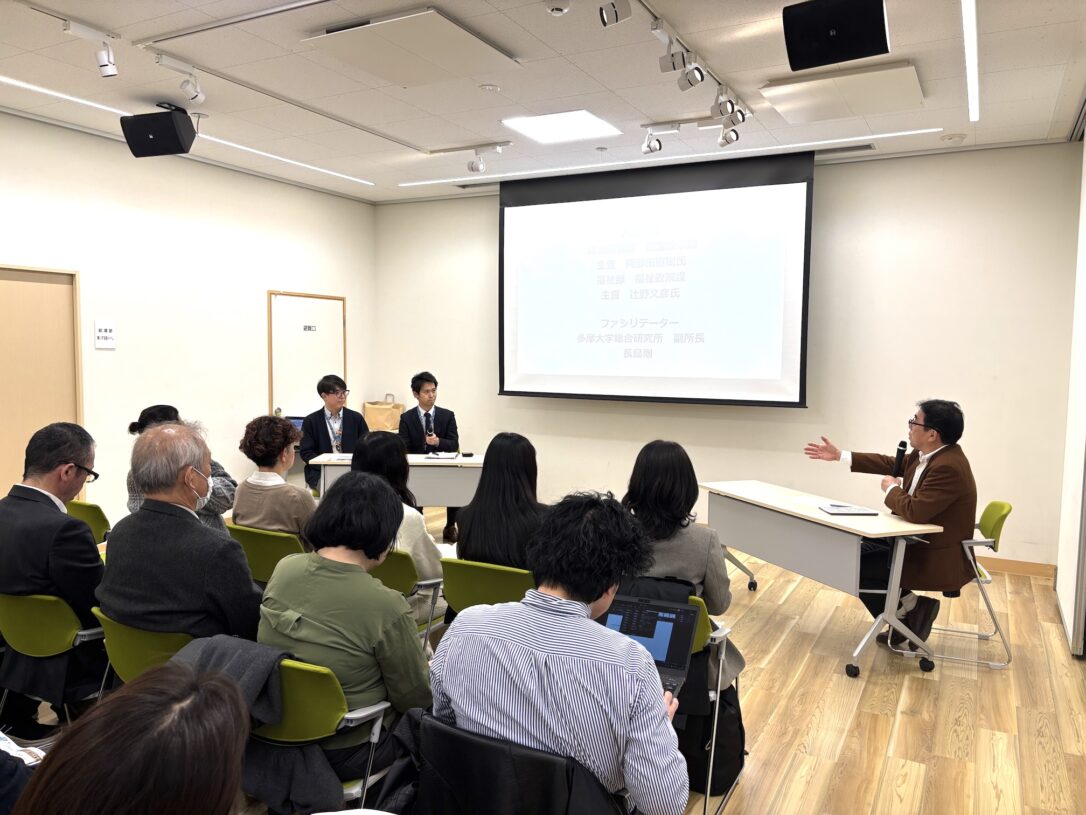 「ことこプロジェクト」は、人や社会とのつながりに不安を感じる市民が気軽に立ち寄れる居場所つくりで、市とNTT東日本株式会社 東京西支店、株式会社まちづくり八王子の3者が2025年10月に連携協定を結んだことから本格的にスタートしました。居場所は今回の会場からすぐの旧矢島染物店で、サロン前後に希望者向け見学も実施。辻野氏からは公的支援につながりやすくなる仕組みつくりとしての共創の活用や、ここまでのプロジェクト活動について説明いただきました。