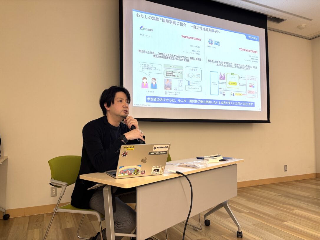 自治体と民間企業の方々5-6人が車座になって感想を話し合う話題共有を経て、後半ではTOPPANエッジ株式会社からの共創提案。同社 ビジネスイノベーションセンター ライフデザイン事業開発部 技術開発チーム チームリーダーの都成大輔氏から「TOPPANエッジの取り組みについて」と題し、「わたしの温度®」についてご紹介いただきました。